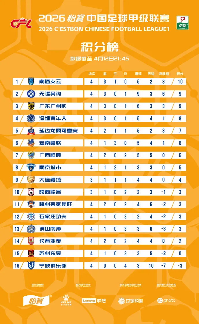 虎扑04月12日讯 2026中甲联赛第四轮比赛今日结束,本日赛况如下。大连鲲城1-2延边龙鼎48'刘云/2'乔瓦尼、90+5'多明戈斯石家庄功夫0-1佛山南狮25'比斯波定南赣联1-1南京城市67'埃里克斯/37’赵诚乐中甲联赛积分榜:来源:虎扑虎扑04月12日讯 2026中甲联赛第四轮比赛今日结束,本日赛况如下。大连鲲城1-2延边龙鼎48'刘云/2'乔瓦尼...